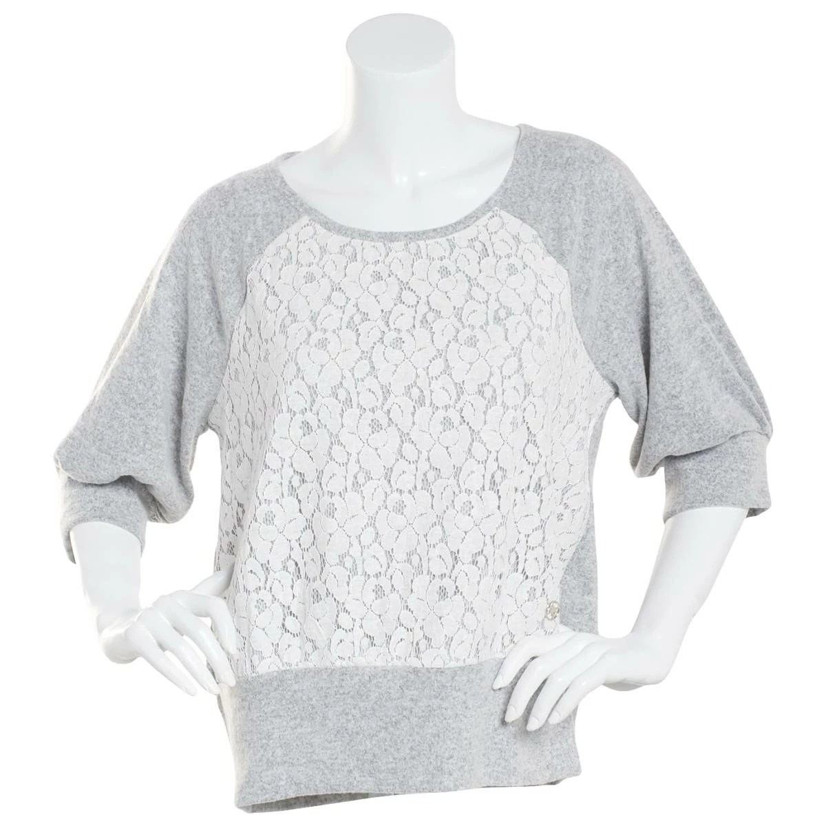 Look and feel your best in this Womens Adrienne Vittadini raglan sweater features a round neckline and elbow sleeves with a lace front.