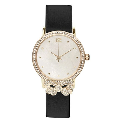 This Adrienne Vittadini bow bezel watch features a 34mm, gold-tone slim case and light champagne gold matte metal dial. The 9 inch, black band finishes off the look.Style AD12950G678-003.Limited Manufacturer’s Warranty.