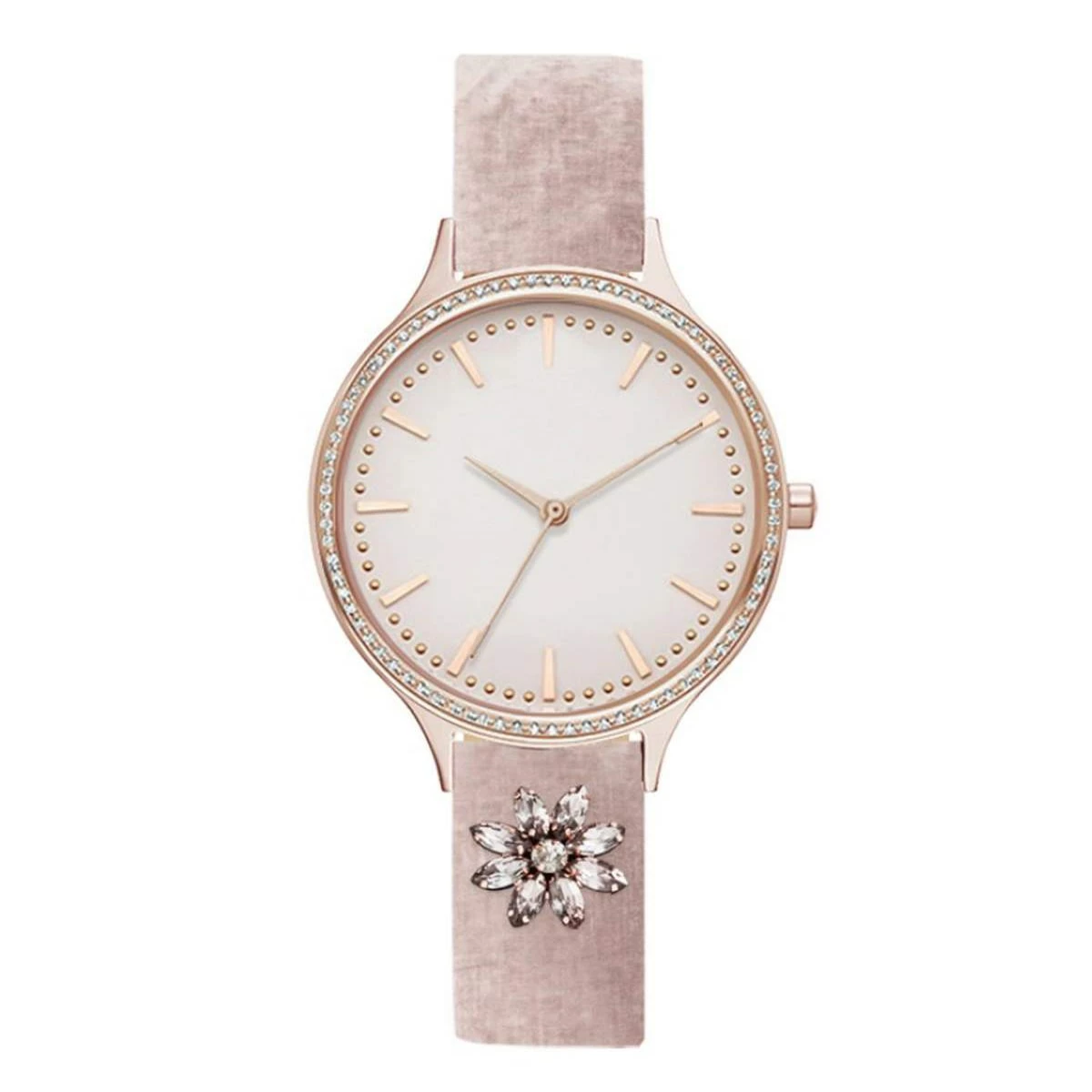 Adrienne Vittadini Flower Watch. Rose gold lovers unite! This blush velvet band is paired with a elegant round face surrounded by rhinestones and floral decor to showcase your glam.