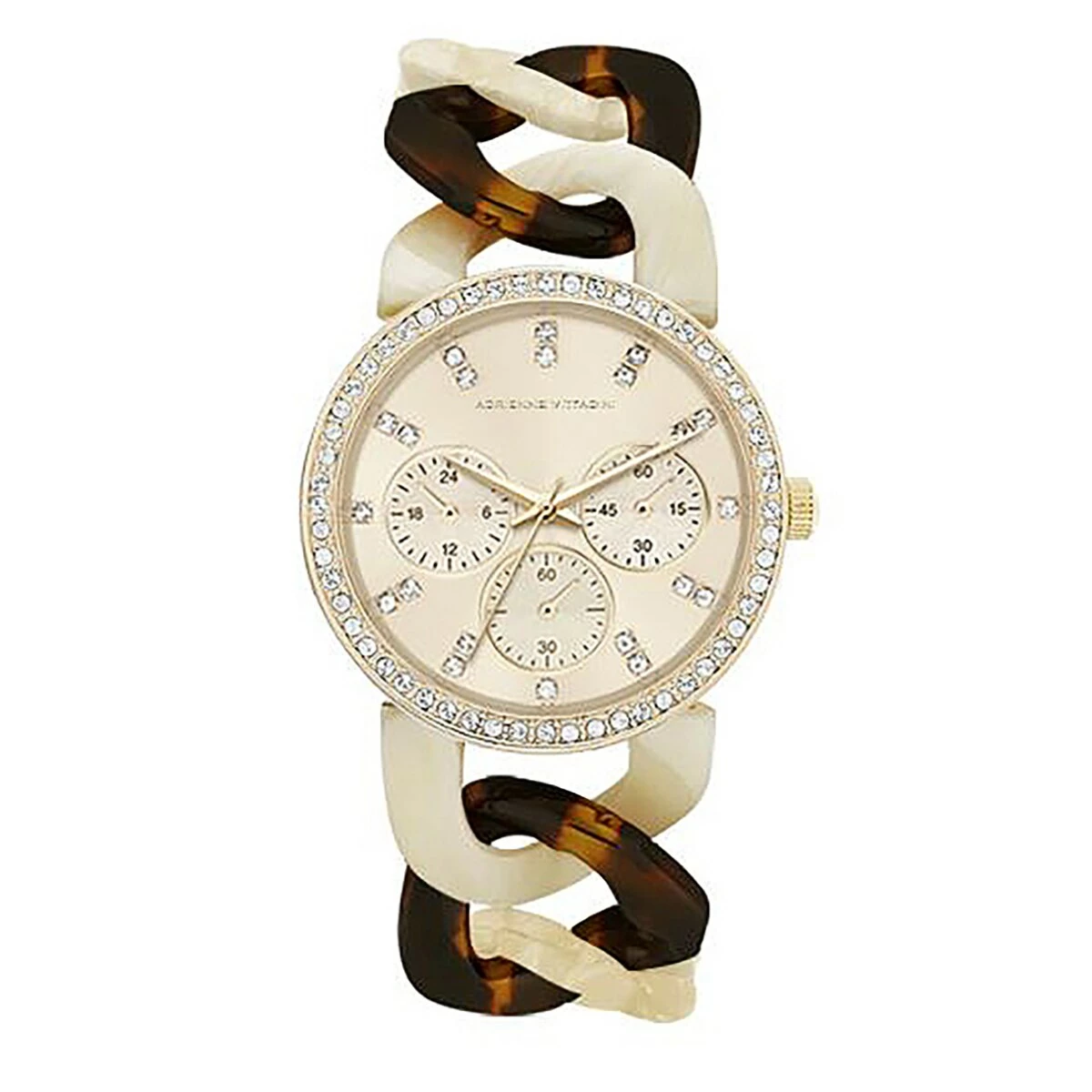 Add a touch of whimsy to your style with this Adrienne Vittadini gold tortoise link band watch with shiny round gold case, stone bezel, and light champagne sunray dial.
