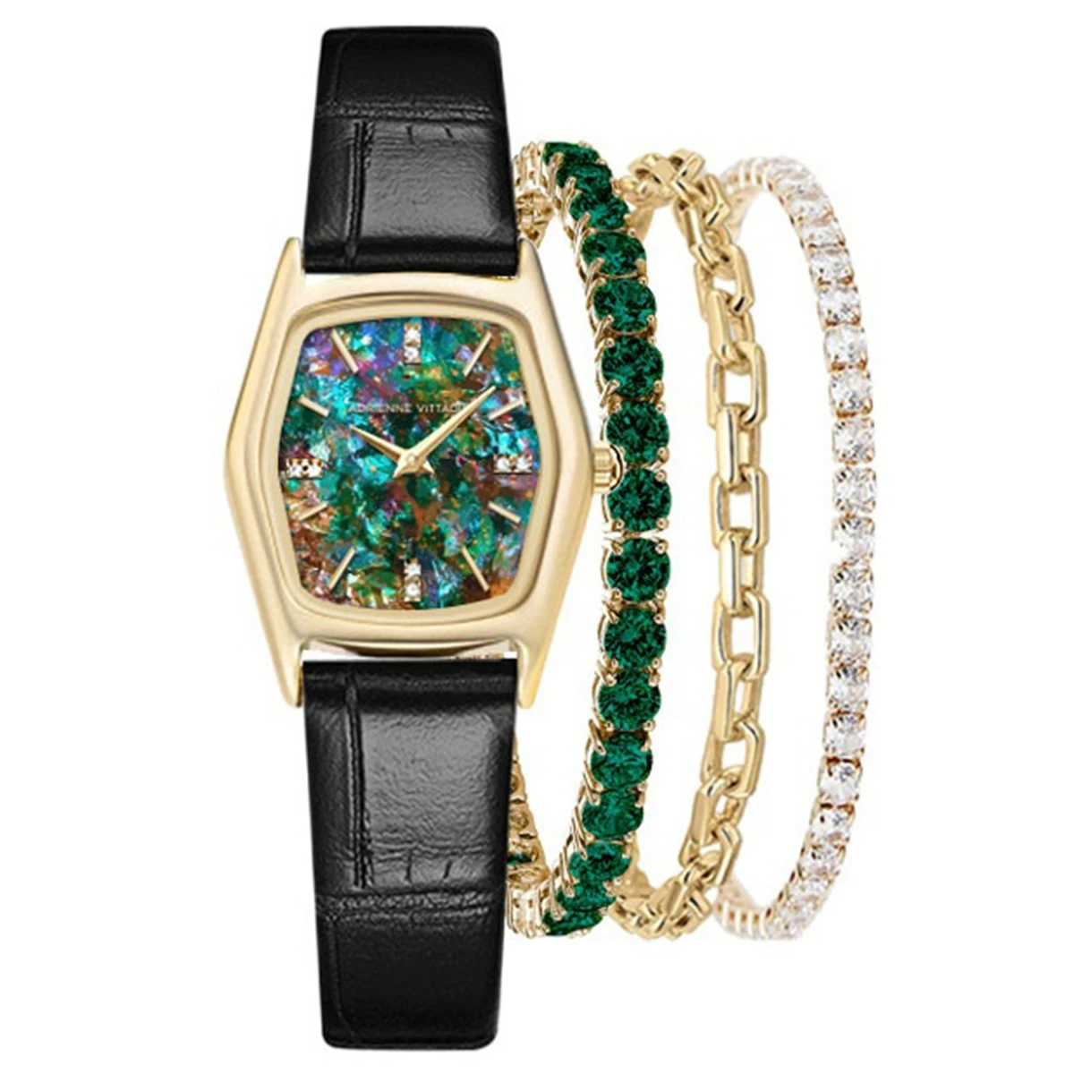 This Adrienne Vittadini Women’s analog watch has a hexagon shiny gold-tone metal case with a thickness of 8mm and a size of 25mm x 33mm(lug to lug) comes along with a black croc leather strap with a length of 229mm and a width of 15mm. It features a 1mm stone number fixture on the multi-color Opal dial and runs on a quartz movement. This watch set comes with a stackable bracelet set which includes an emerald crystal stone bracelet, a 6 x 11mm square chain bracelet, and a crystal stone bracelet.