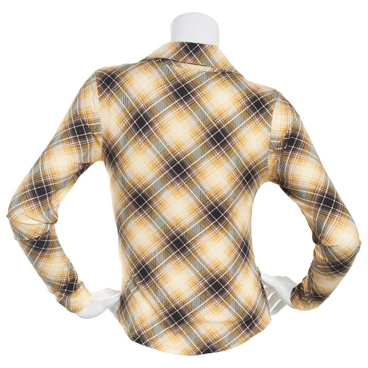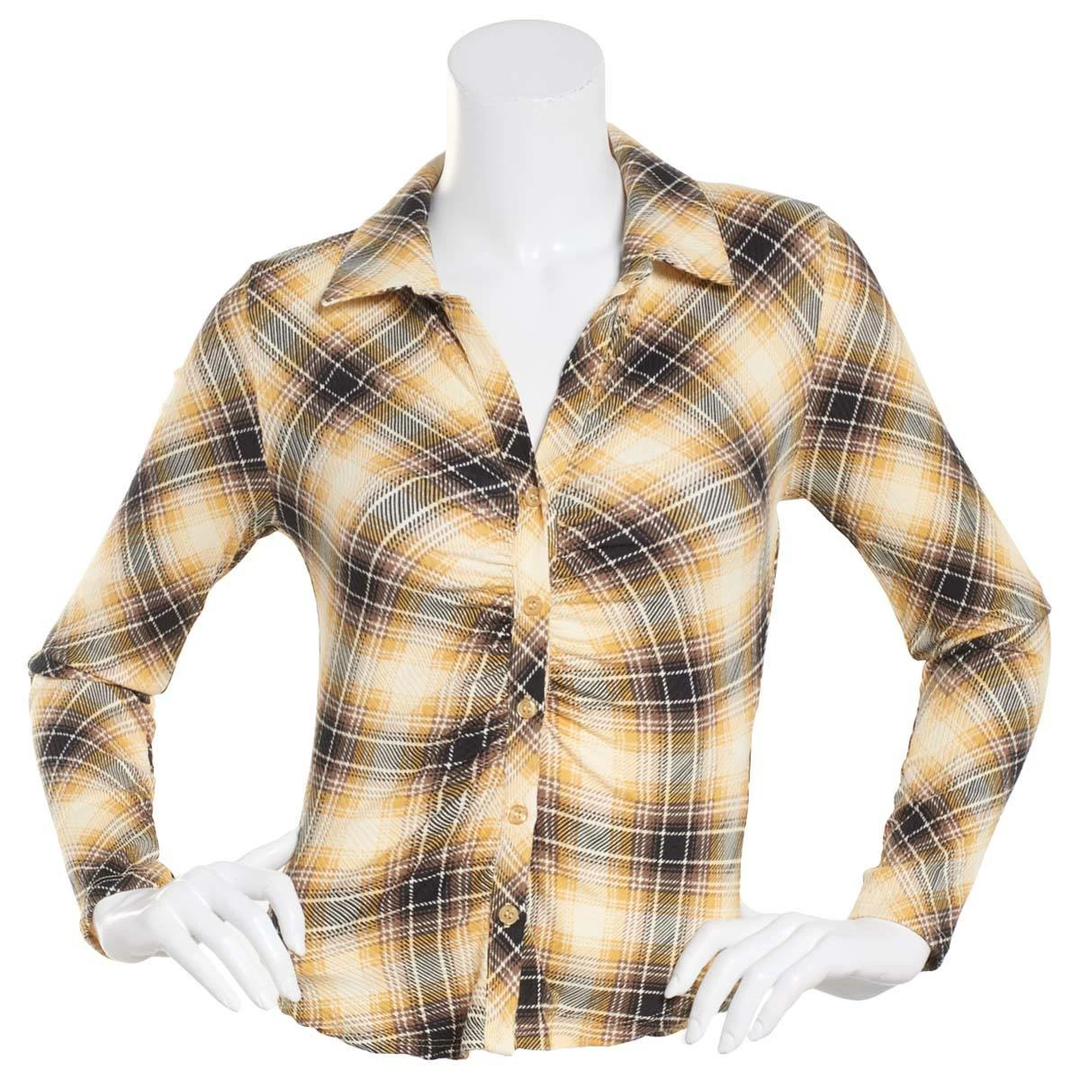 Step up your style with this Juniors Almost Famous™ brushed plaid shirttail top that features a v neckline a button front and long sleeves with a rib-ruched placket.