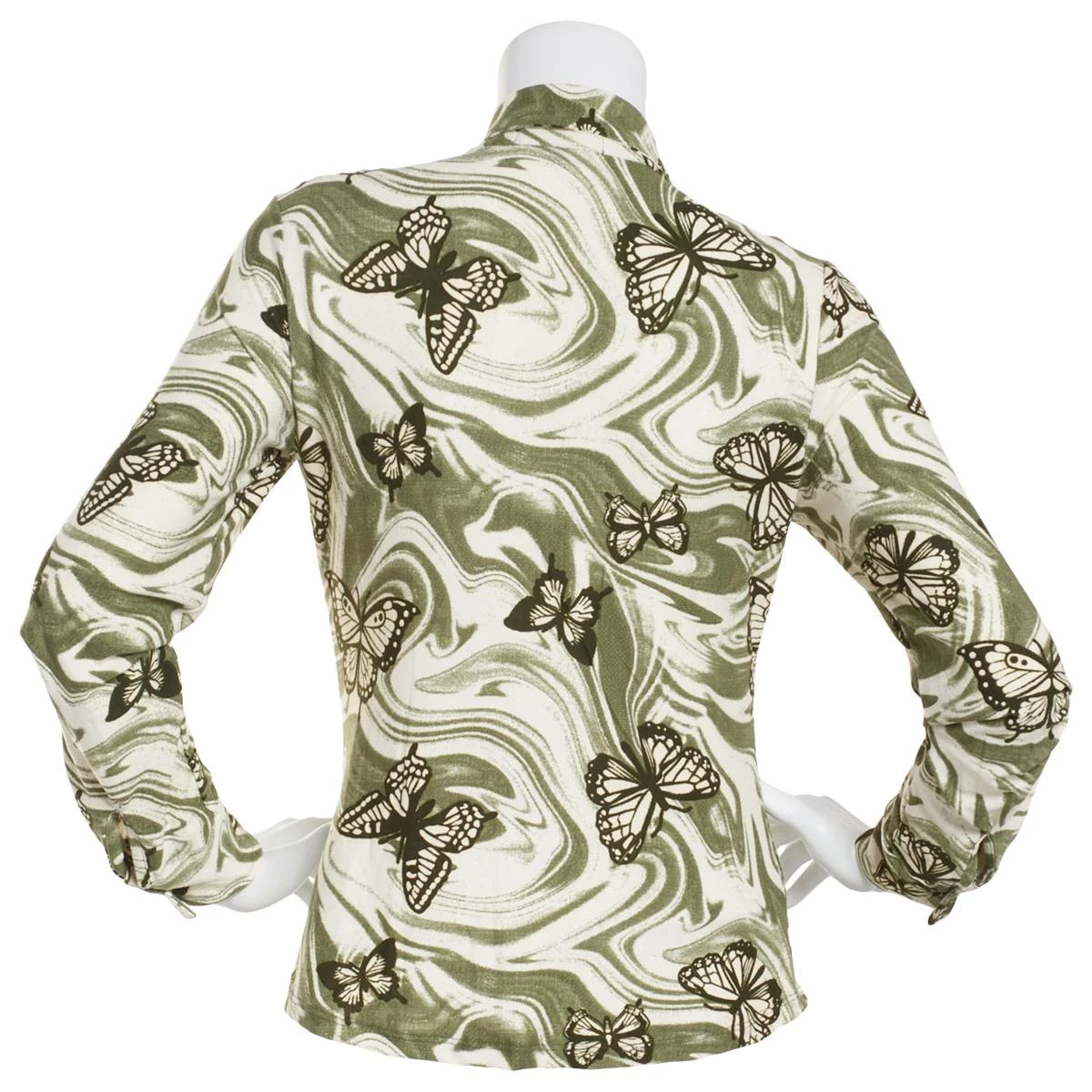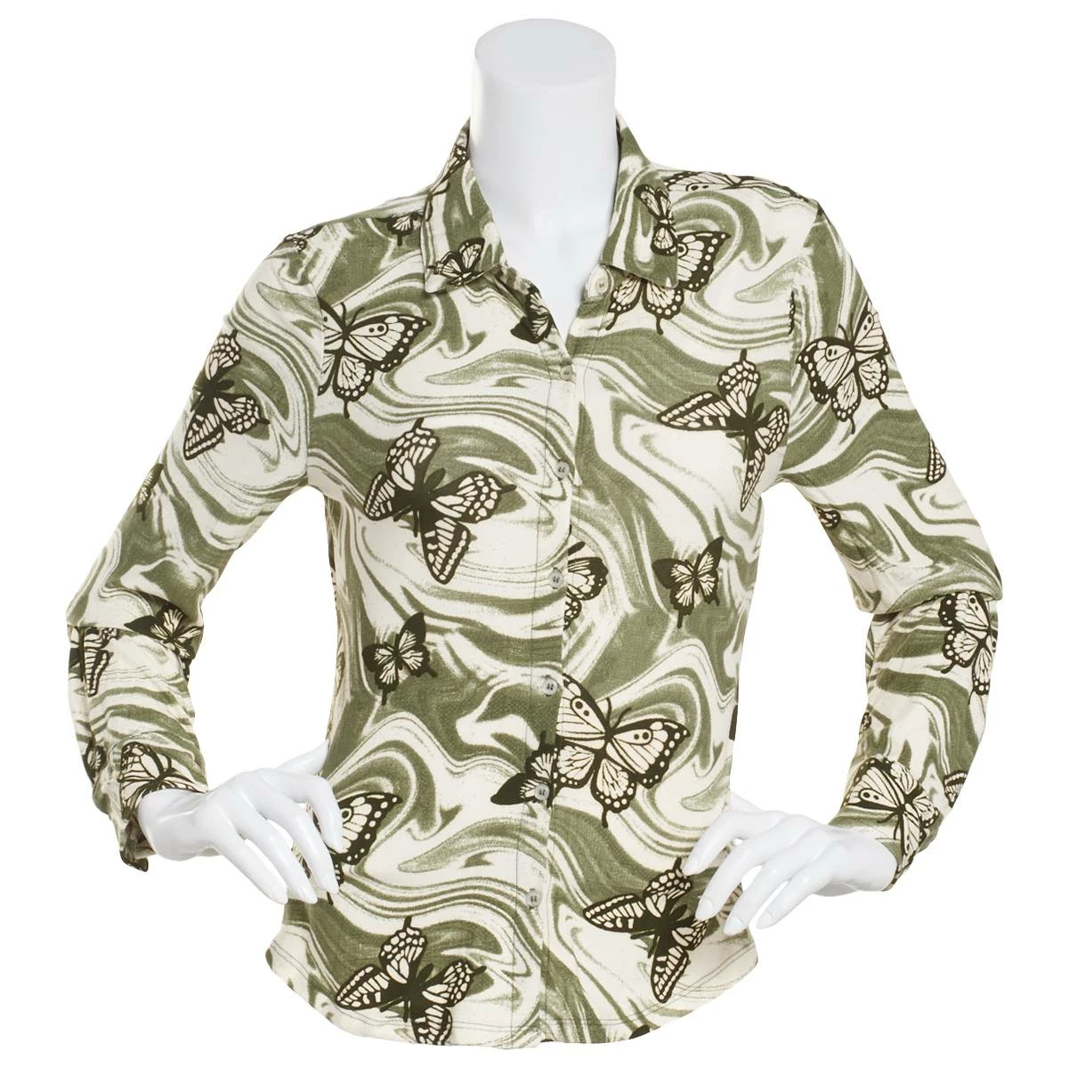 Add this style to your wardrobe with this Juniors Almost Famous™ butterfly print yummy button front and a split neckline with long sleeves.