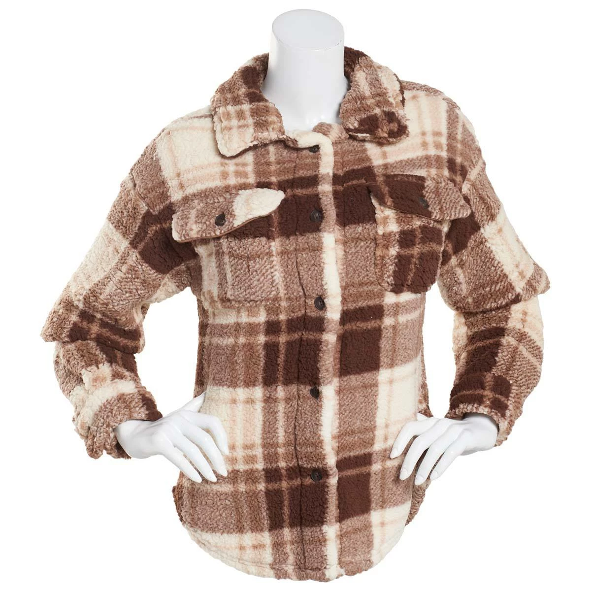 Give your casual collection an update with this Juniors Almost Famous™ printed single side sherpa shacket that features a button front and chest pockets.