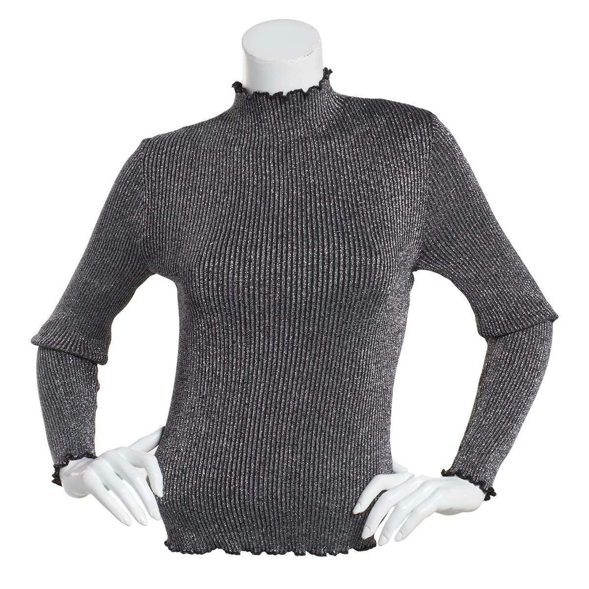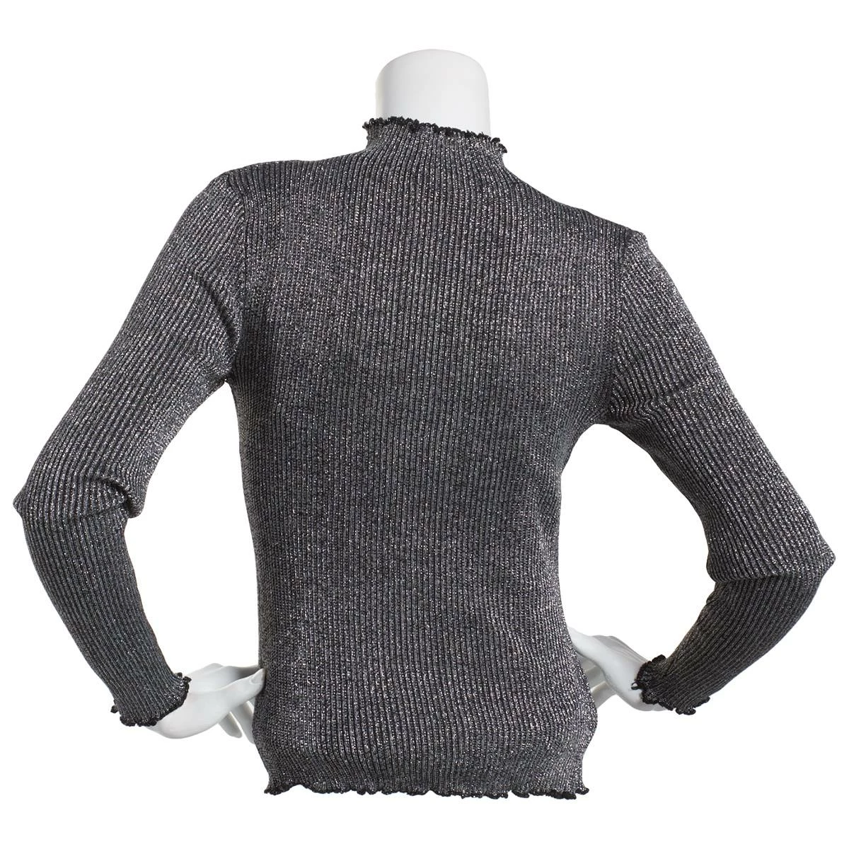 Liven up your look with this Juniors Almost Famous™ lurex pullover sweater features a mock neck, long sleeves, and a lattice edge.