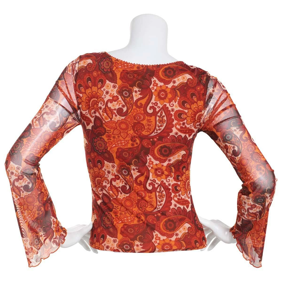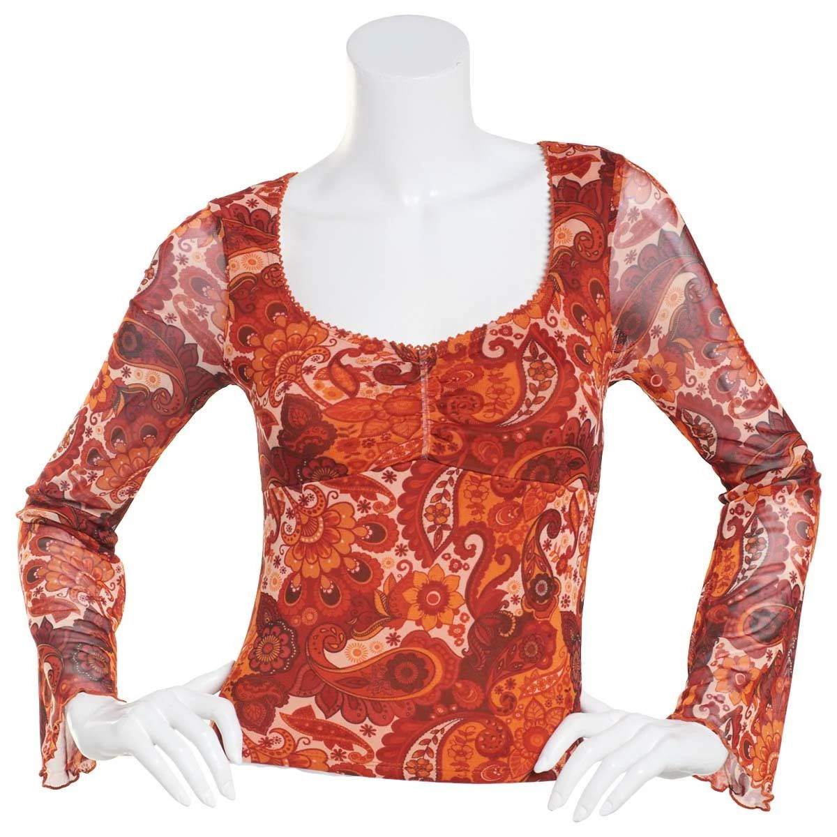 The Juniors Almost Famous™ mesh bell sleeve picot trim top features a v-neckline and long sleeves. Pair with jeans or pants for a complete look.