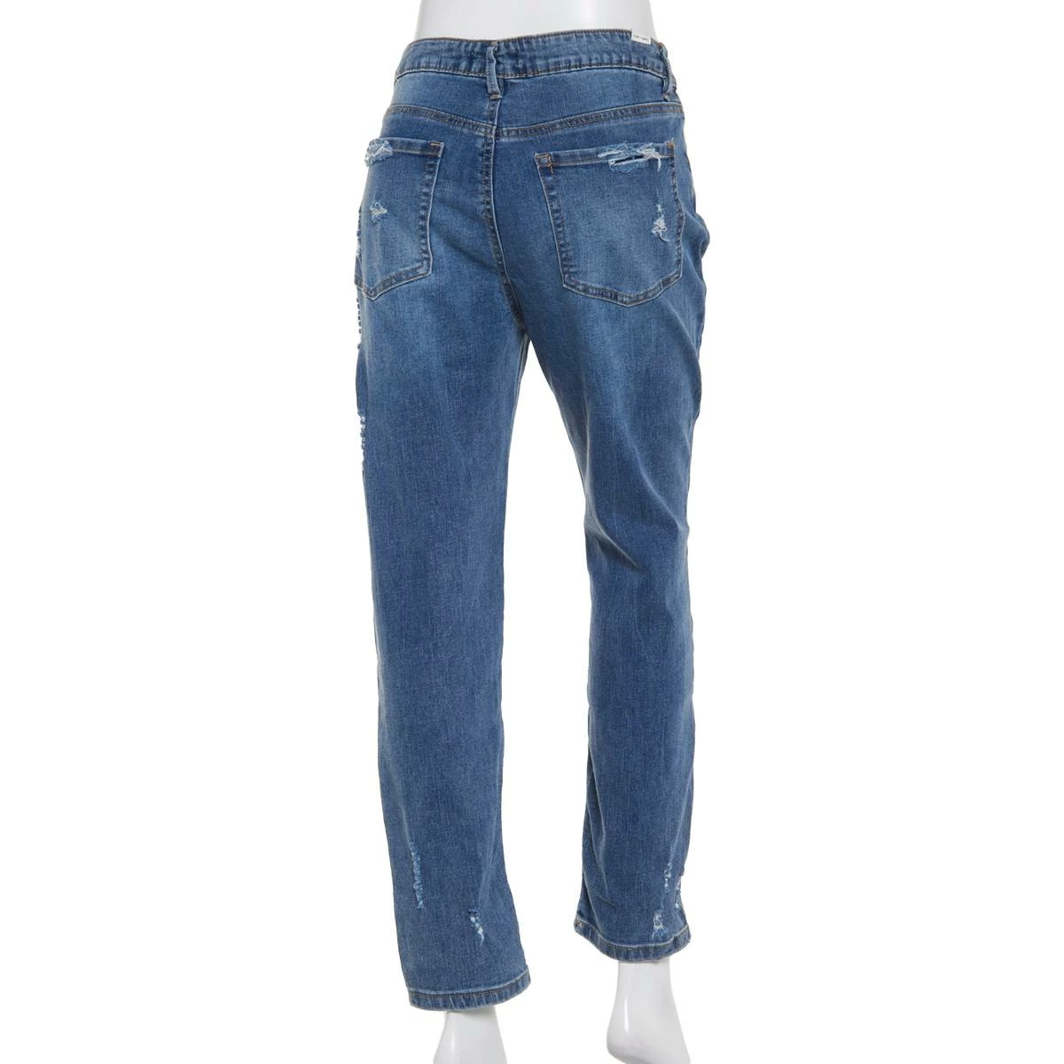 Add some style with this Juniors Almost Famous™ mom jean update with destruction features five pockets. pair it up with your favorite top.