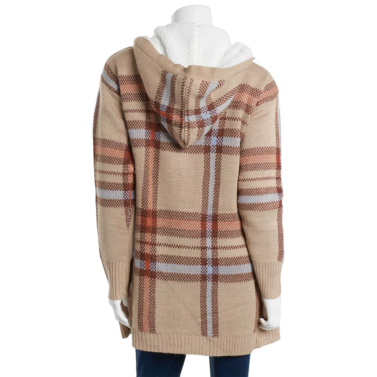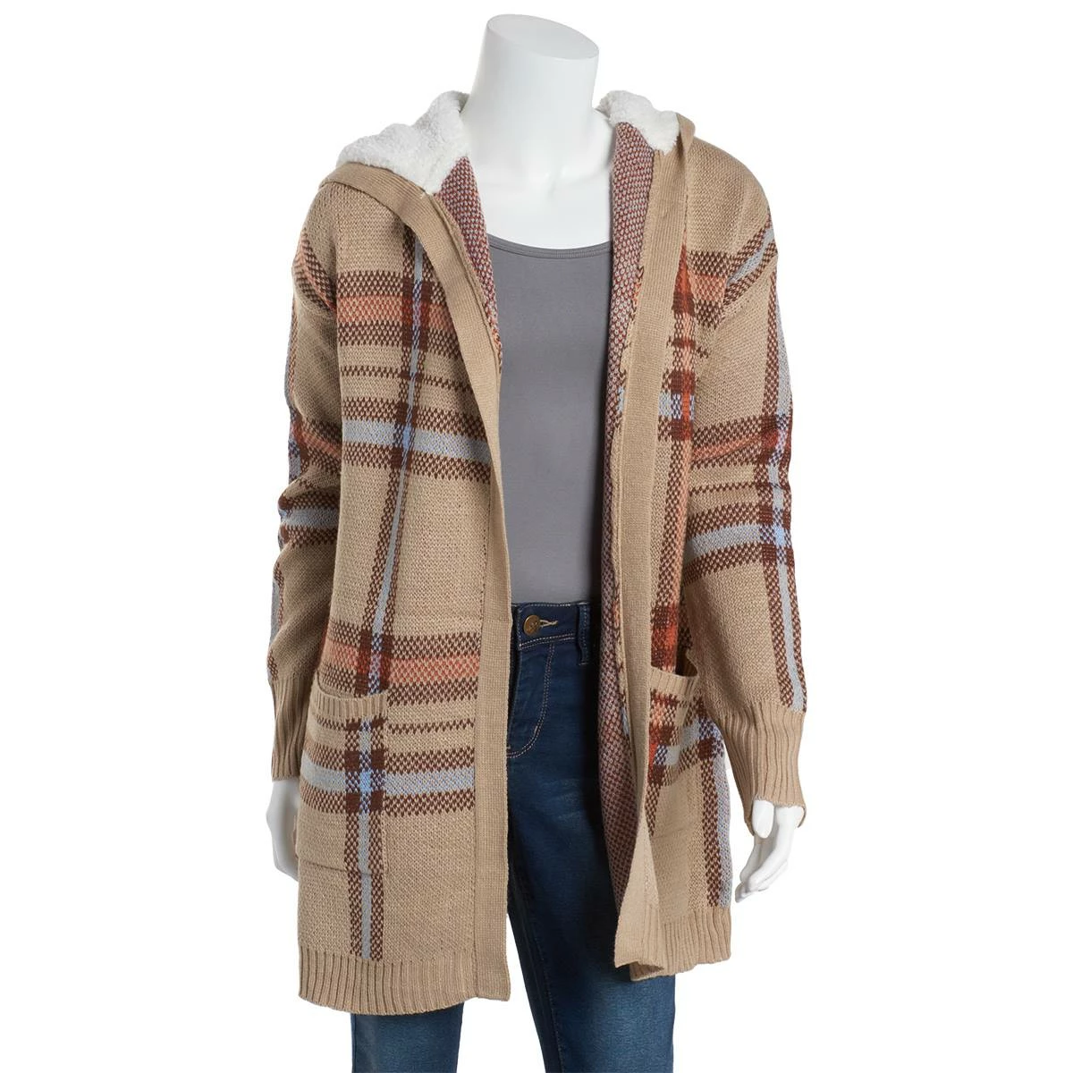Stay cozy and layer this up with this Juniors Almost Famous plaid jacquard cardigan that features a Sherpa line hood and long sleeves with front pockets.