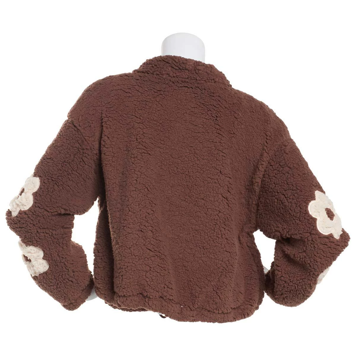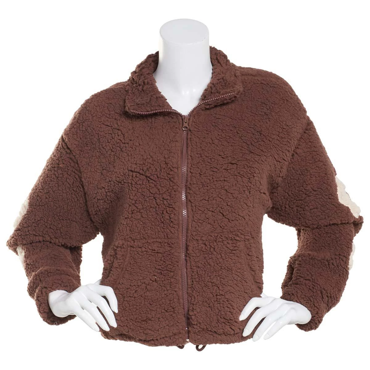 Cuddle up wearing this Juniors Almost Famous™ zip up Sherpa applique sleeve jacket that features a zipper front and long sleeves and pockets.