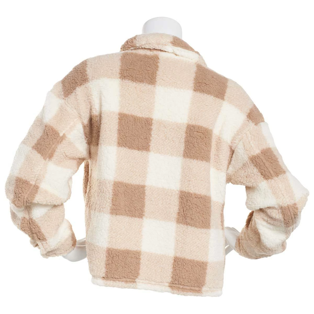 make getting dressed easy with this Juniors Almost Famous™ printed sherpa crop shacket that features a button front with long sleeves and chest pockets.