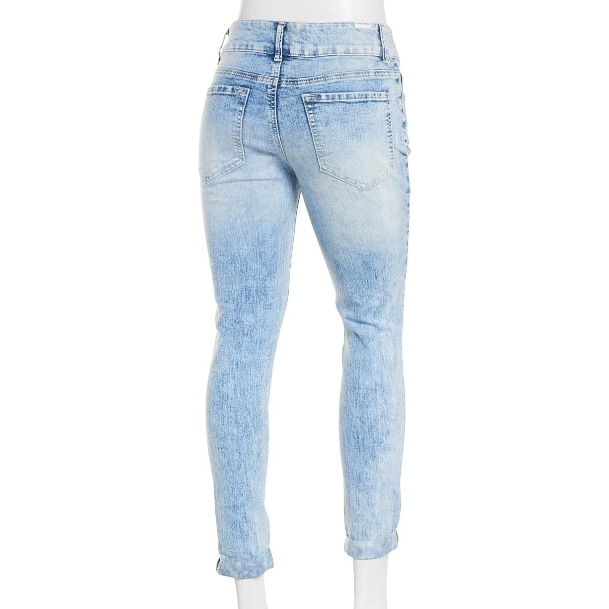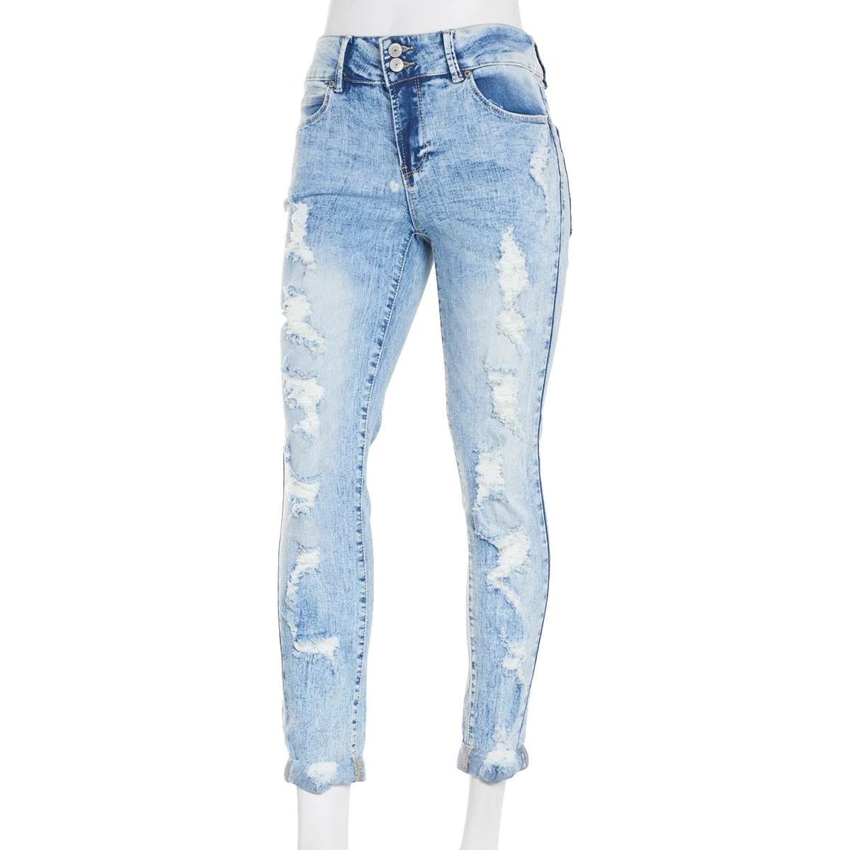 The Juniors Almost Famous™ two button roll cuff skinny jeans that feature destruction rips, and pockets.
